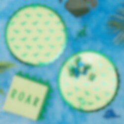 8 kpl hienoja paperilautasia vihreäfolioidulla reunalla ja keskellä kuva dinosauruksesta. Lautaset ovat n. 24 cm halkaisijaltaan. Sopivat myös tarjoiluastiaksi.