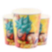 8 kpl. pahvimukeja tyylikkäällä Dragon Ball -kuviolla. Mukit ovat noin 9 cm korkeita ja niiden tilavuus on noin 250 ml.