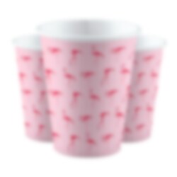 8 kpl vaaleanpunaisia pahvimukeja, joissa on kuvia flamingoista. Mukit ovat 10 cm korkeita ja tilavuudeltaan n. 250 ml.