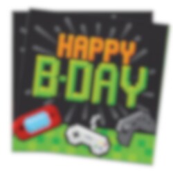 16 kpl mustia ja vihreitä servettejä coolilla peli-aiheella ja keskellä teksti "Happy B-Day". Servetit ovat 2-kerroksisia ja n. 33 x 33 cm avattuna.