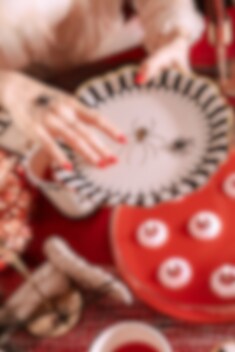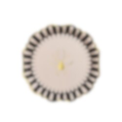 Kata tyylikäs Halloweenpöytä eleganttien pahvilautasien avulla. Pehmeä taustaväri varmistaa, että hohtava kultahämähäkki erottuu hyvin. Reunassa on mustia raitoja, jotka päättyvät kultafolioon luoden ylellisen vaikutelman.