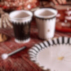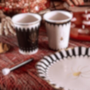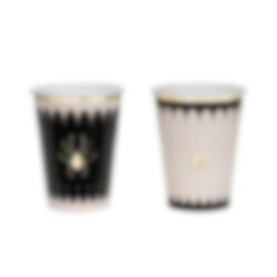 Kata pöytä tyylikkäillä pahvimukeilla tunnelmallista Halloweenia varten. Jokaisessa mukissa on hohtava kultahämähäkki ja koristeellinen reuna kultafoliolla, mikä antaa ylellisen tunteen. Setti sisältää kaksi erilaista mallia, jotka sopivat yhteen sarjan muiden tuotteiden kanssa.
