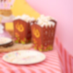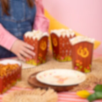 Luo maalaistyylinen ja ihana tunnelma juhliin näillä kauniilla hevosteeman popcornrasioilla. Kuvio muistuttaa tallin seinää, joka on koristeltu hevosenkengillä ja kukilla. Sopii täydellisesti pienille ratsastajille ja heppafaneille.