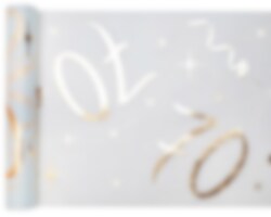 Valkoinen kaitaliina, jossa on koristekuvioita ja kultafolioitu numero 70. Tämä kaitaliina toimitetaan kätevästi rullana. Se on 30 cm leveä ja 5 metriä pitkä. Se riittää usempiin pöytiin ja isompaan juhlaan. Materiaali on 100 % polyesteria.