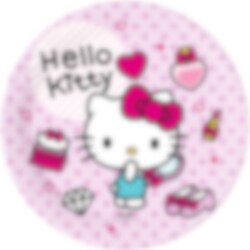 8 vaaleanpunaista pilkullista lautasta, joissa on Hello Kitty -kuva ja muita kivoja yksityiskohtia.