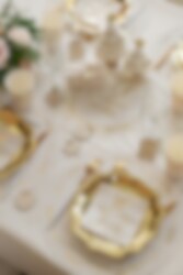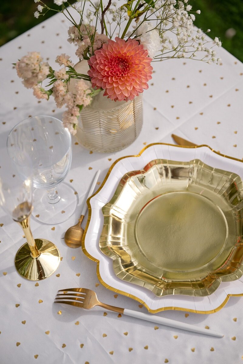 Luo tyylikäs kattaus näillä kultafolioiduilla lautasilla, jotka sopivat yhtä hyvin syntymäpäiville, ristiäisiin, baby showereihin, uudenvuoden juhliin, häihin ja muihin juhlaviin tilaisuuksiin. Kiiltävä kultaväri antaa kattaukselle elegantin tunnelman ja helpottaa koko pöydän ilmeen kohottamista pienin keinoin.