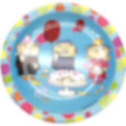8 kpl pahvilautasia, joissa on värikkäitä juhlakuvia Mikko Mallikas -sarjan Mikosta ja hänen ystävistään. Lautasten halkaisija on noin 17,5 cm.