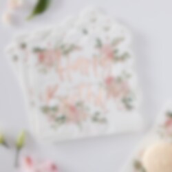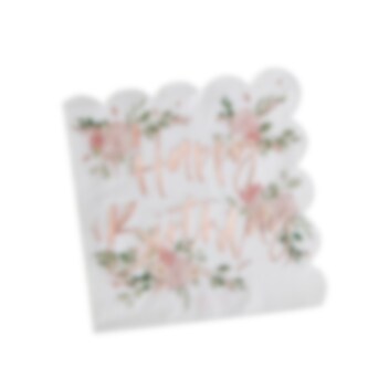 16 kpl kauniita servettejä söpöllä kukkakuviolla ja tekstillä "Happy Birthday" ruusukullanvärisenä toisella puolella. Servetit ovat 2-kerroksisia ja n. 33 x 33 cm.