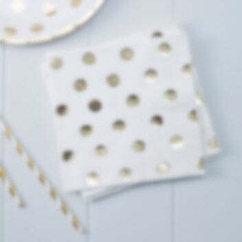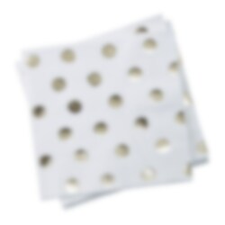 20 tyylikästä valkoista lautasliinaa kullanhohtoisilla foliopilkuilla. Lautasliinat ovat hieno yksityiskohta juhlapöydässä tai bileissä. Lautasliinat ovat 3-kerroksisia ja niiden koko on 33 x 33 cm.