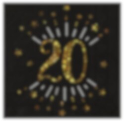 10 kpl mustia servettejä, joissa on koristeellisia kuvioita ja numero 20 kultaisella glitterillä. Nämä servetit ovat täydellisiä pöydän kattamiseen 20-vuotisjuhliin. Servetit ovat kolmikerroksisia ja tuntuvat ylellisiltä. Avattuna niiden mitat ovat 16,5 x 16,5 cm.