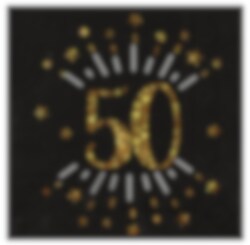10 kpl mustia servettejä, joissa on koristeellisia kuvioita ja numero 50 kultaisella glitterillä. Nämä servetit ovat täydellisiä pöydän kattamiseen 50-vuotisjuhliin. Servetit ovat kolmikerroksisia ja tuntuvat ylellisiltä. Avattuna niiden mitat ovat 16,5 x 16,5 cm.