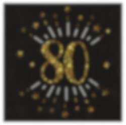 10 kpl mustia servettejä, joissa on koristeellisia kuvioita ja numero 80 kultaisella glitterillä. Nämä servetit ovat täydellisiä pöydän kattamiseen 80-vuotisjuhliin. Servetit ovat kolmikerroksisia ja tuntuvat ylellisiltä. Avattuna niiden mitat ovat 16,5 x 16,5 cm.