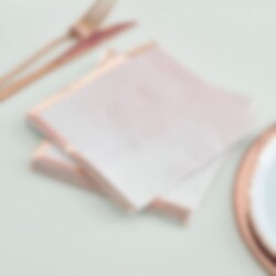 16 kaunista pastelliväristä servettiä, joiden reunat ovat ruusukullan väriset. Täydellinen lisä juhlien kattaukseen. Servettien pinnassa on myös kiiltävä vaikutelma. Servetit ovat kaksikerroksisia ja noin 33 x 33 cm kokoisia avattuna.