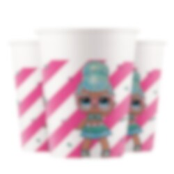 8 kpl pahvimukeja vaaleanpunaisen sävyissä kuvalla Queen Beestä ja hänen ystävistään nukkesarjasta LOL Surprise. Kaunis täydennys juhlakattaukseen. Mukit ovat n. 10 cm korkeita ja tilavuus on n. 200 ml.