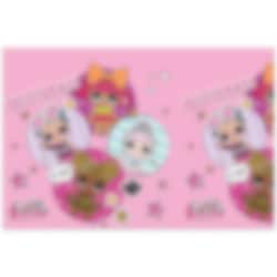 Muovinen pöytäliina vaaleanpunaisen sävyissä kuvalla Glitterati-kerhon jäsenistä LOL Surprisesta. Tyylikäs lisä juhlakattaukseen. Pöytäliina on n. 120 x 180 cm.