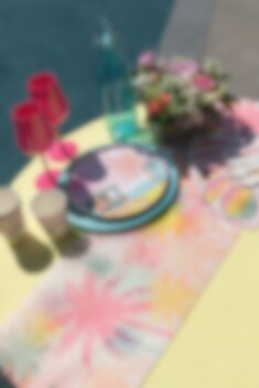 Pastellivärinen kaunis kaitaliina, jonka design vie ajatukset lämpimän kohteeseen palmujen alle. Kaitaliina on täydellinen ihaniin kesäjuhliin.