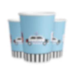 8 kpl pahvimukeja, joissa on ajoneuvoteema vaaleansinisellä taustalla ja valkoisilla reunoilla. Hieno koriste ajoneuvoteemaisille syntymäpäiville. Mukit ovat noin 10 cm korkeita ja niihin mahtuu noin 250 ml.