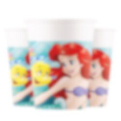 8 kpl pahvimukeja, joissa on söpö prinsessa Arielin kuva. Mukit ovat 10 cm korkeita ja niiden tilavuus 200 ml.