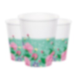 8 kpl valkoisia ja mintunvihreitä paperimukeja värikkäällä kukkakuviolla. Mukit ovat noin 10 cm korkeita ja tilavuudeltaan noin 266 ml.