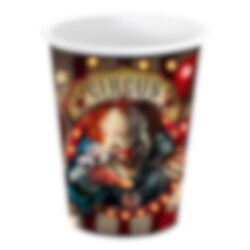 6 kpl pahvimukeja pelottavalla sirkusteemalla, täydelliset halloween-juhliin. Mukit ovat noin 9 cm korkeita, ja niihin mahtuu 240 ml.