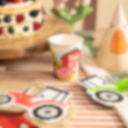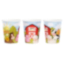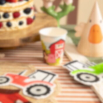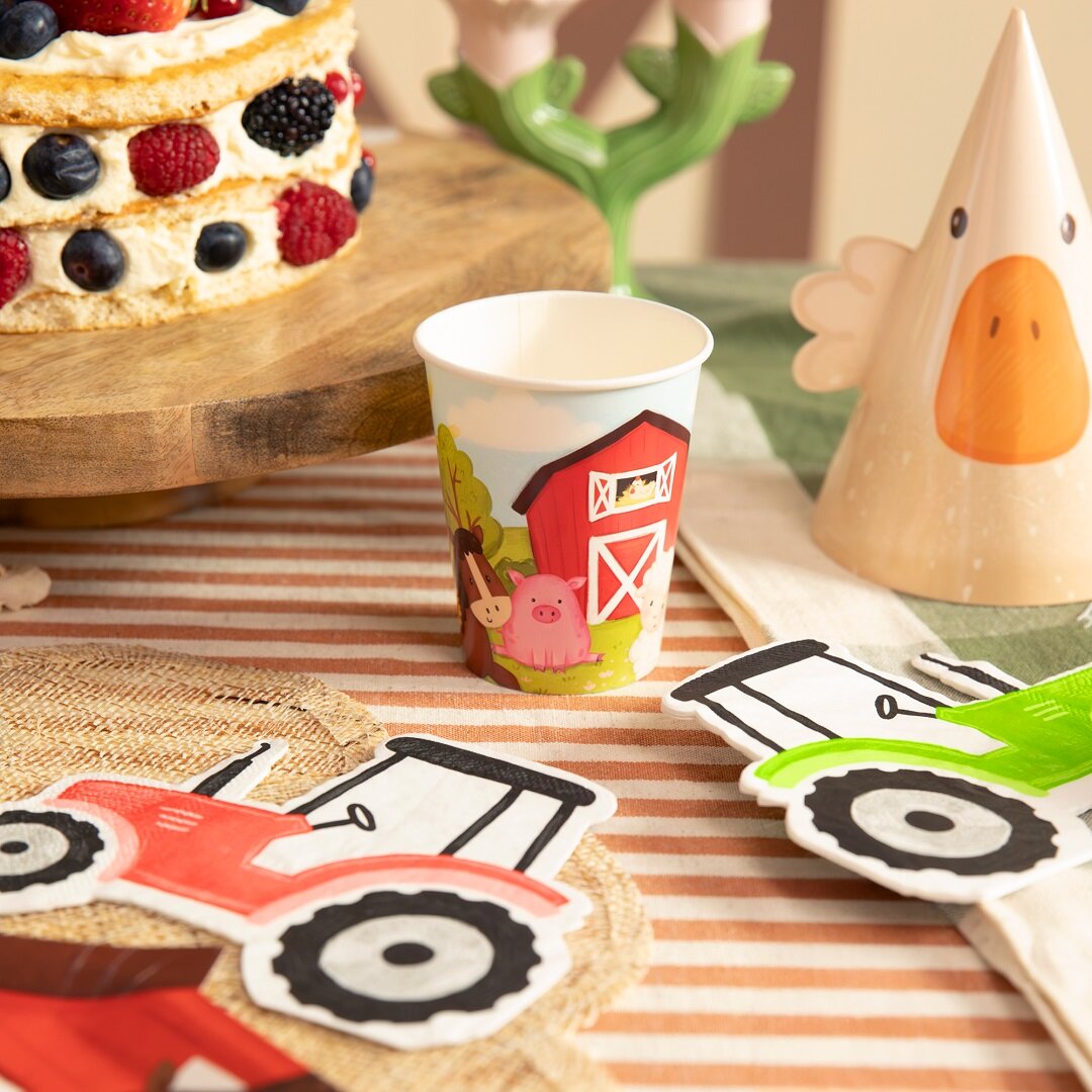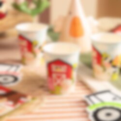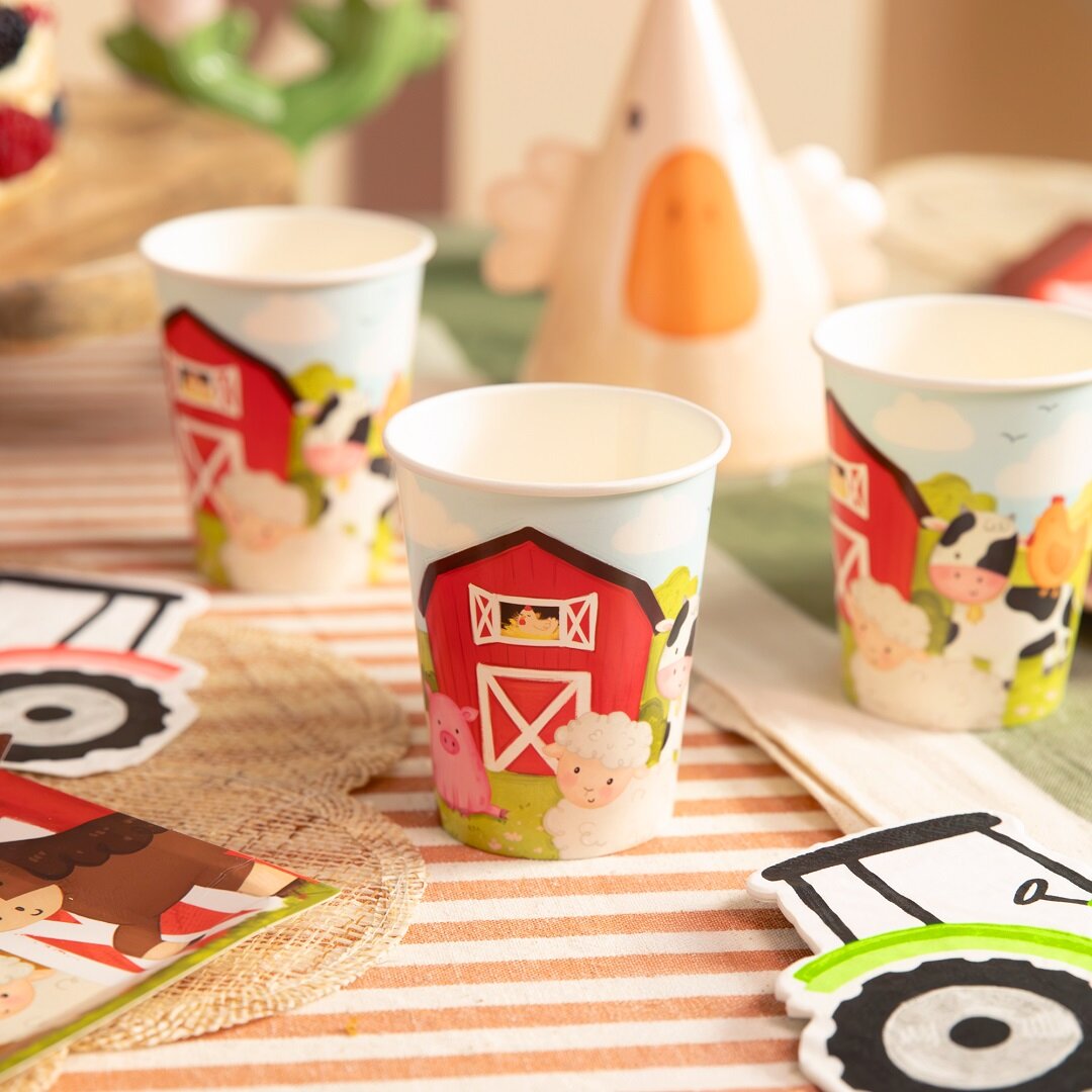 6 kpl maatila-aiheisia pahvimukeja, jotka tekevät kattauksesta erityisen leikkisän lasten synttärijuhliin. Mukeja koristavat söpöt maatilan eläimet, punainen lato ja maalaishenkinen kuvio, jotka sopivat täydellisesti maatilateemaisiin juhliin.