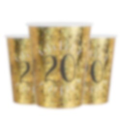10 kpl kimaltavia kullanvärisiä pahvimukeja jossa on numero 20. Nämä mukit sopivat täydellisesti 20-vuotisjuhliin.