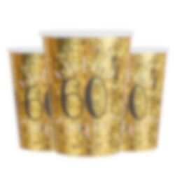 10 kpl kimaltavia kullanvärisiä pahvimukeja jossa on numero 60. Nämä mukit sopivat täydellisesti 60-vuotisjuhliin.