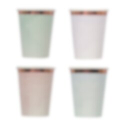 8 paperimukia neljässä hienossa pastellivärissä kiiltävällä vaikutelmalla ja ruusukultaisella reunalla. Tee juhlien kattauksesta erityisen hieno näillä mukeilla. Mukit ovat noin 10 cm korkeita ja niihin mahtuu noin 266 ml.