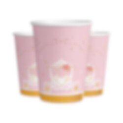 8 kpl pahvimukeja kuvalla prinsessavaunuista kultafolioiduilla reunoilla vaaleanpunaisella taustalla teemasta Princess for a Day. Mukit ovat n. 9 cm korkeita ja tilavuudeltaan n. 250 ml.