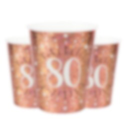 10 kpl tyylikkäitä, ruusukullanvärisiä kimaltavia pahvimukeja jossa on numero "80".