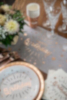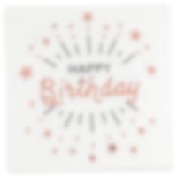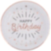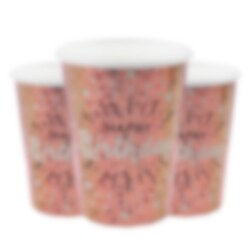 10 kpl pahvimukeja jossa on hieno ruusukullanvärinen foliokoristelu ja teksti "Happy Birthday". Yhdistä muiden saman Sparkling Happy Birthday-sarjan lautasten, servettien ja muiden juhlatarvikkeiden kanssa.
