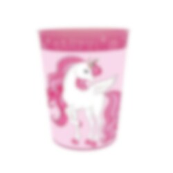 Yksisarvismuovimuki kovasta muovista. Mukia voidaan käyttää uudelleen ja uudelleen ja se kestää myös konepesun. Muki on hauska ja hieman erilainen vaihtoehto tavalliselle juhlapussille ja sen voi täyttää karkilla, naposteltavilla tai lelulla. Parasta siinä on, että vieraat saavat viedä mukin kotiin muistoksi.