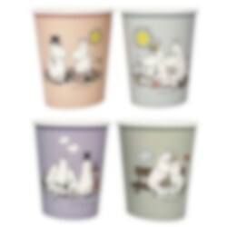 8 kpl pahvimukeja, joissa on ihania Muumien kuvia, jotka muuttavat juhlat taianomaiseksi kokemukseksi Muumilaaksossa.