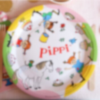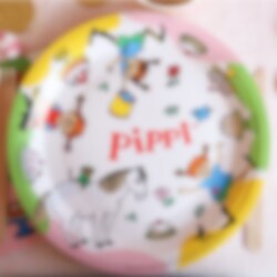 8 kpl värikkäitä pahvilautasia hauskoilla kuvilla Pepistä ja hänen ystävistään Astrid Lindgrenin kirjoista Peppi Pitkätossu. Nämä lautaset ovat 23 cm halkaisijaltaan.