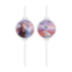 4 kpl paperipillejä, joissa on kuvia Frozen 2 -elokuvan Annasta, Elsasta ja Olafista. Juomapillien pituus on n. 19 cm ja koristeiden läpimitta n. 7 cm.