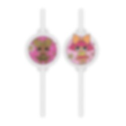 4 kpl paperipillejä LOL Surprise-teemalla. Hauska tarvike mukaan synttäreiden pöytäkattaukseen. Pillit ovat noin 22 cm pitkiä ja kuvan halkaisija on noin 7 cm.