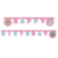 Koristeellinen paperinen viiri vaaleanpunaisen sävyissä kuvalla nukeista Crystal Queen, Luxe ja Splash Queen sekä tekstillä "Happy Birthday” vaaleanpunaisella ja pastellinsinisellä toisella puolella. Kaunis koriste seinälle LOL Surprise -aiheisiin juhliin. Viiri on n. 2 metriä pitkä.