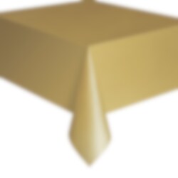 Suuri ja kaunis kullanvärinen pöytäliina, joka sopii hienosti juhla- tai synttärikattaukseen. Koko 137 x 274 cm.