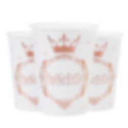 10 kpl hienoja valkoisia, prinsessa-aiheisia pahvimukeja jossa on hieno ruusukullanvärinen foliokoristelu.