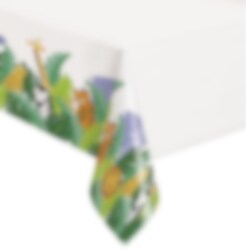 Tyylikäs muovinen pöytäliina jossa on valkoinen pohja sekä koristeena suloisia ja värikkäitä viidakon eläimiä. Hieno pöytäliina erityisesti viidakkoaiheisiin juhliin.