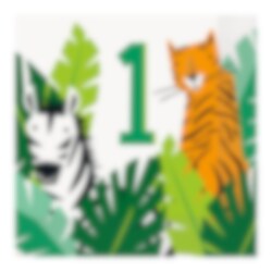 16 kpl valkoisia servettejä jossa seikkailevat suloiset viidakon eläimet. Serveteissä on myös numero 1 joten ne sopivat hyvin 1-vuotisjuhliin. Hienot servetit sopivat myös erinomaisesti viidakkoaiheisiin juhliin.