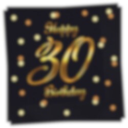 20 mustaa servettiä, joissa on kultainen kuvio ja numero 30. Servetit sopivat täydellisesti pöydän kattamiseen 30-vuotisjuhliin. Aukitaitettuna ne ovat kooltaan 33 x 33 cm.