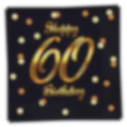 20 mustaa servettiä, joissa on kultainen kuvio ja numero 60. Servetit sopivat täydellisesti pöydän kattamiseen 60-vuotisjuhliin. Aukitaitettuna ne ovat kooltaan 33 x 33 cm.