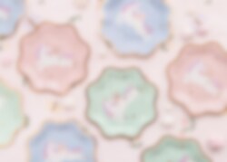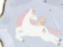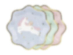 Luo maaginen kattaus näillä kauniilla yksisarvislautasilla! Lautaset on koristeltu lumoavalla yksisarvisella, joka laukkaa tähtien ja pilvien keskellä, ympäröitynä elegantilla aaltomaisella reunalla, jossa on kultafolioyksityiskohtia. Pehmeät sinisen, vaaleanpunaisen ja mintunvihreän pastellisävyt tekevät niistä täydellisen yksityiskohdan synttäreille, prinsessajuhliin tai muihin satumaisiin tilaisuuksiin.