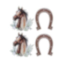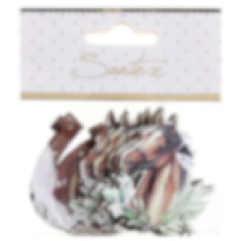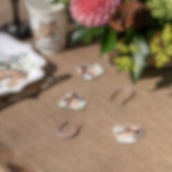 Hieno puukonfetti hevosilla ja hevosenkengillä. Ylellinen pöydänkoriste juhliin. Konfetit ovat kooltaan 4 x 4,5 cm ja pussissa on yhteensä 10 kappaletta.