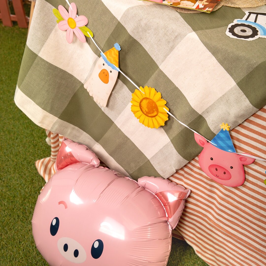 Paperiviirinauha söpöillä maatilan eläimillä ja kukilla, joka on viehättävä koriste lasten synttärijuhliin. Leikkisät kuvat, joissa on kana, hevonen, lammas, hanhi, possu, lehmä ja värikkäät kukat, sopivat täydellisesti luomaan lämpimän ja juhlavan tunnelman maatilateemaiseen synttärijuhlaan.