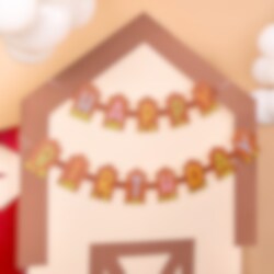 Paperiviirinauha Happy Birthday -tekstillä on viehättävä koriste maatila-aiheisiin lasten synttärijuhliin. Kirjaimet on muotoiltu pieniksi puuaidoiksi värikkäillä yksityiskohdilla, ja ne sopivat täydellisesti luomaan leikkisän ja juhlavan tunnelman huoneeseen.