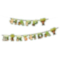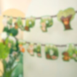 Kaunis pahvinen viirinauha. Siinä on teksti "Happy Birthday" ja söpöjä metsäeläinkuvioita – täydellinen koriste metsäeläinaiheisiin juhliin.