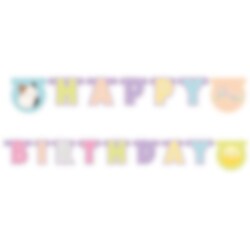 Tyylikäs paperinen viirinauha tekstillä "Happy Birthday" ja Squishmallows-kuvioinnilla. Viiri on 2 metriä pitkä.