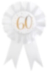 Kaunis valkokultainen ruusuke, jossa on numero 60. Ruusuketta voidaan käyttää sekä koristeena esimerkiksi kukka-asetelmissa että synttärisankarin asusteena 30-vuotispäivänä. Ruusuke on halkaisijaltaan 8 cm ja 15 cm korkea.